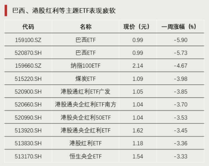 上周,两只巴西主题ETF周跌幅均超5%。此外,红利板块表现疲软,港股红利赛道多只相关主题ETF跌超3%。