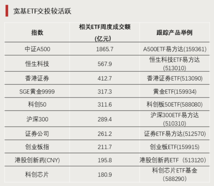 上周,大盘宽基产品成交活跃,A500ETF易方达(159361)等跟踪中证A500指数的ETF合计成交额超1800亿元。此外,多只跟踪双创类指数的ETF也有较高成交额。
